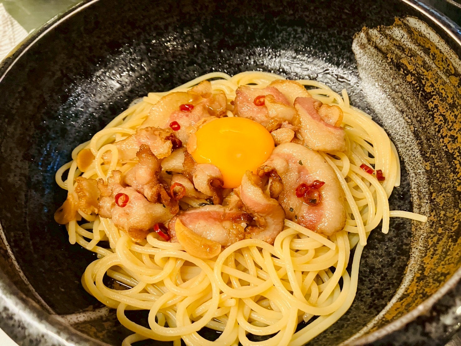 金太郎卵、ベーコンのペペロンチーノ