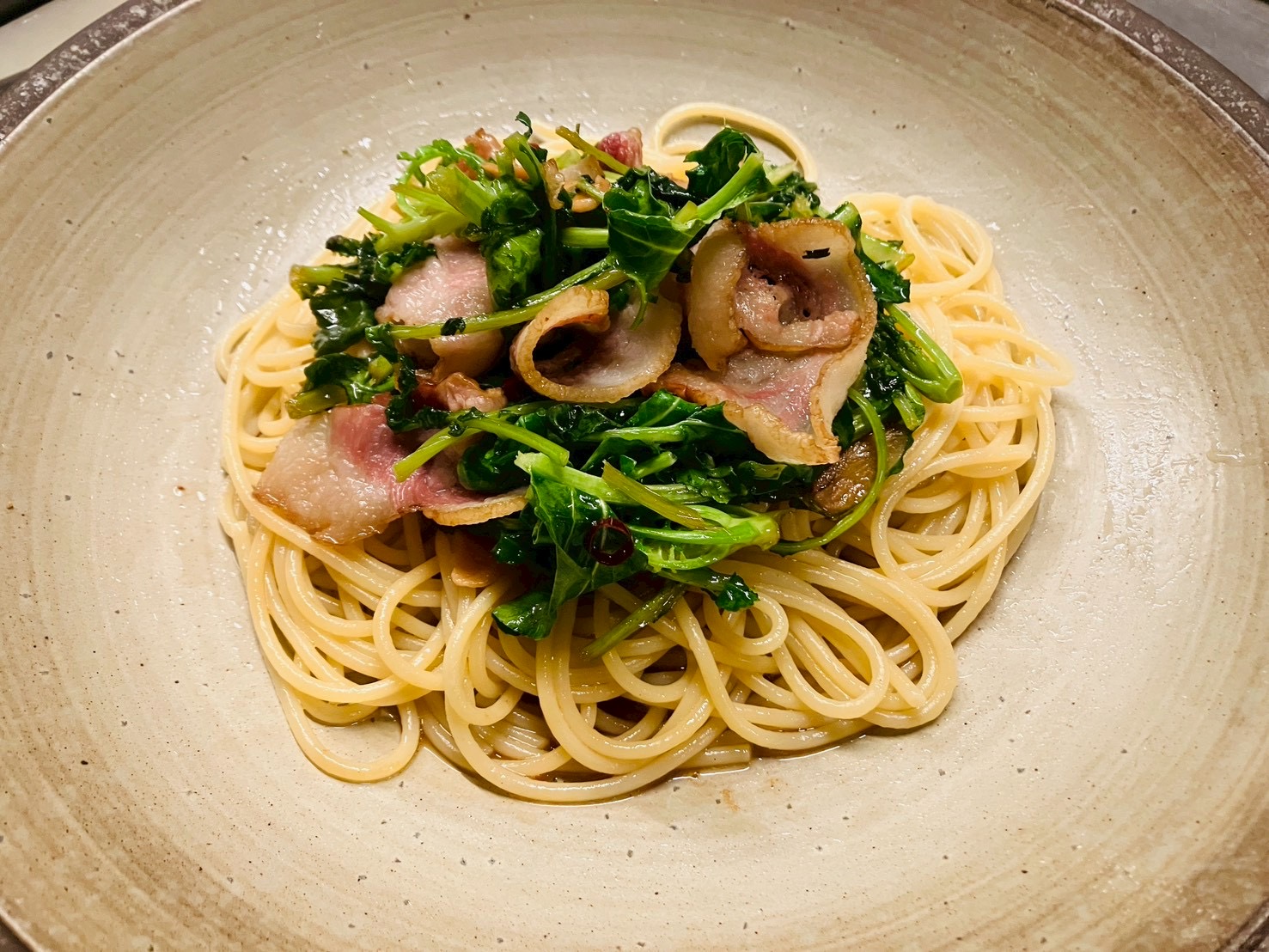 ブロッコロフィオラーロ、ベーコンのペペロンチーノ