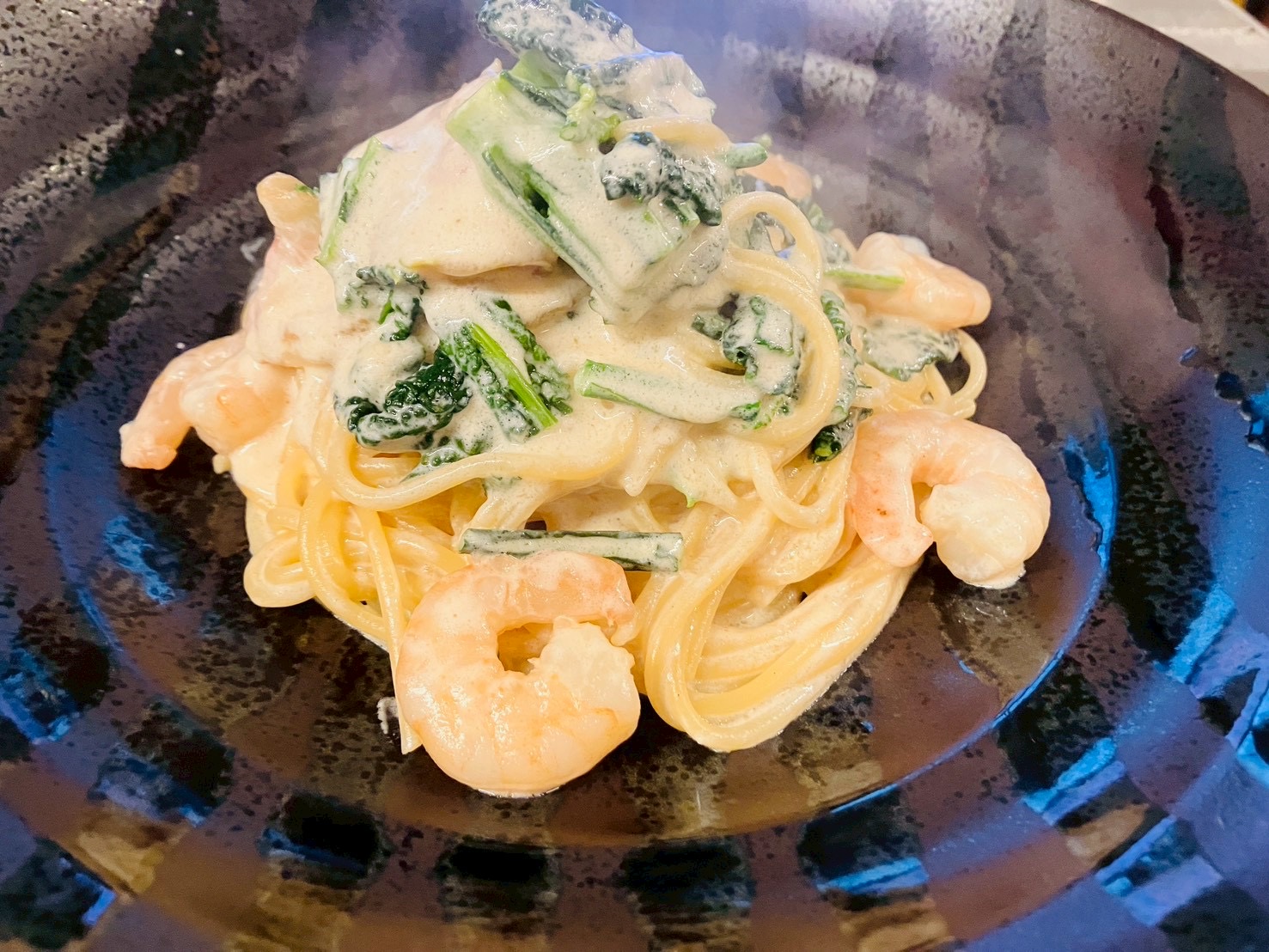 ベビーネロ、海老、ベーコンのクリームソース