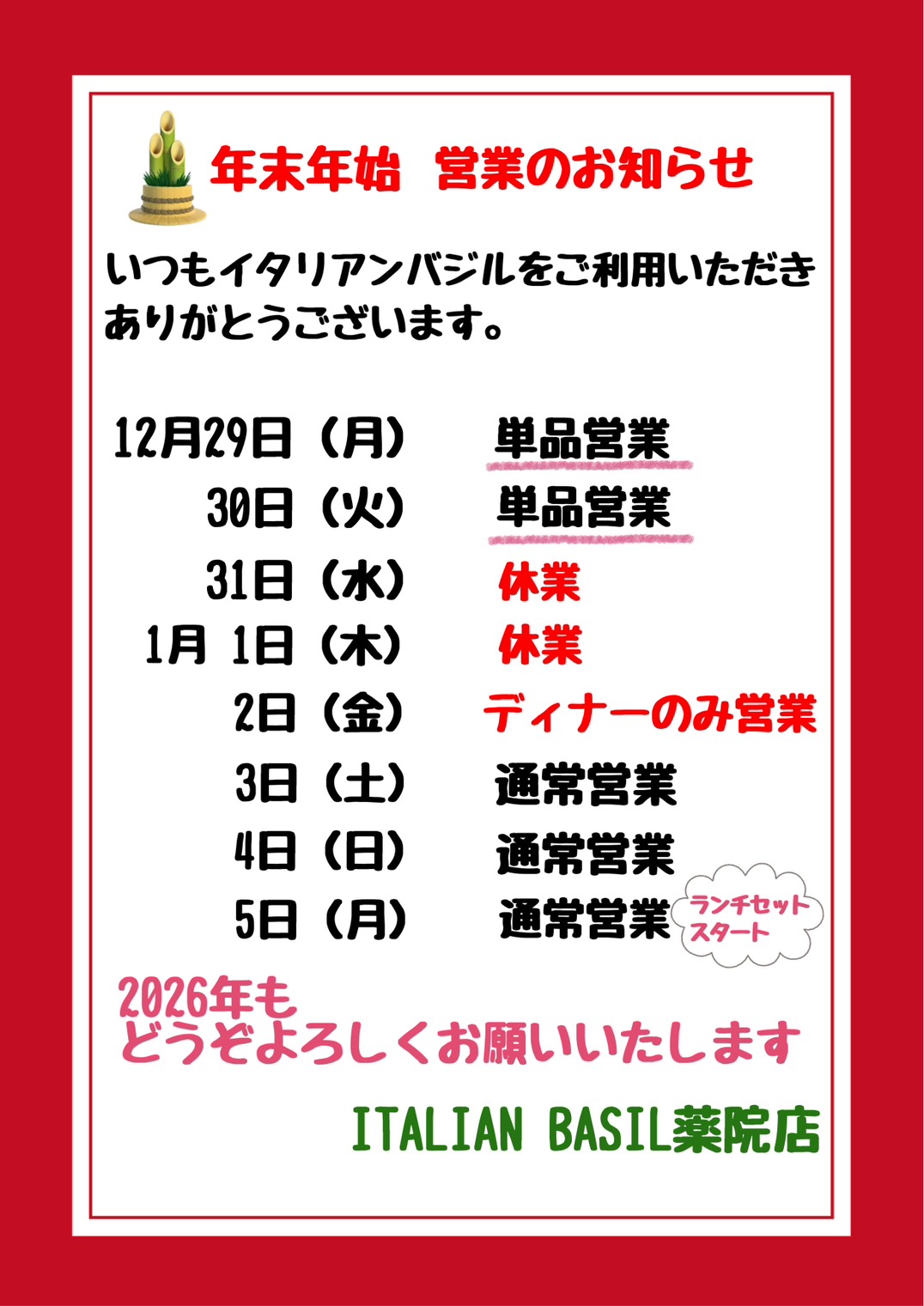 12 192025 年末年始 営業のお知らせ 日頃よりイタリアンバジルをご愛顧いただき、 ありがとうございます 年末年始は下記の通り営業いたします。 どうぞよろしくお願いいたします。 Tweet Share Hatena Pocket RSS feedly Pin it 営業日のお知らせ 10/27~11/2 前の記事